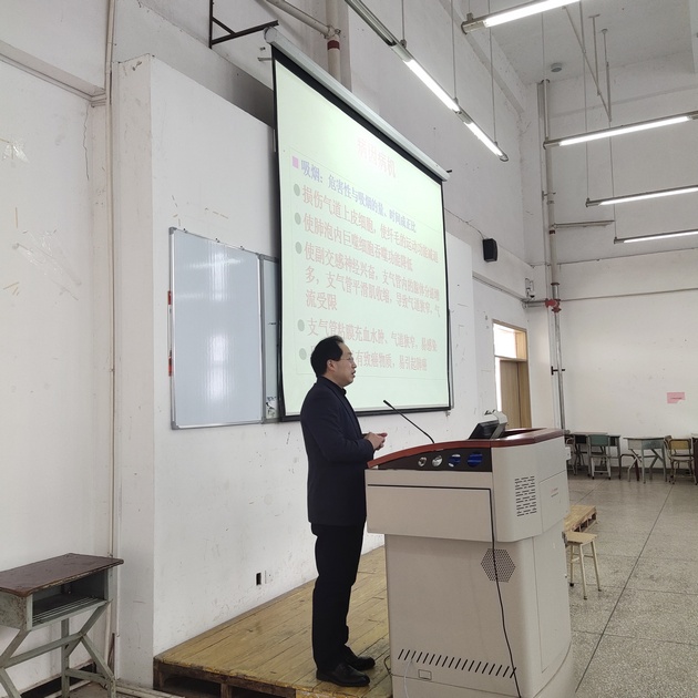 为提高同学们对吸烟喝酒危害的认识,共创无烟和谐校园。云顶国际vip.888于12月2日在青年路图阶101举行“吸烟喝酒对人体的危害”讲座。由护理公司党总支书记杨泽刚主讲,60余名同学参加。