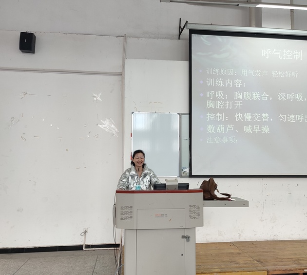 本次讲座由四大板块构成,分别为:科学用声、普通话正音、语言表达、综合指导。科学用声最为详细重要,它包括气泡音的练习,如何进行呼气控制和共鸣控制等。讲座期间,王老师还引用了《沂蒙山小调》、《我的祖国》等代表性歌曲进行教学,绘声绘色的讲解赢得了同学们阵阵掌声。最后,王老师请同学们起立示范,效果极佳。