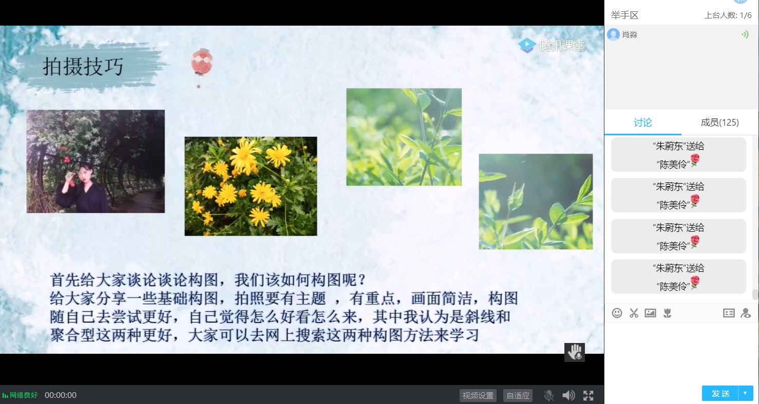 本次比赛以“万众疫心,未来可期”——我眼中的春暖花开为主题,分为作品展示和选手讲解两个环节。选手们结合立意、取景、拍摄技巧等对自己的参赛作品进行了声情并茂的讲解,表达了自己对大自然的崇敬、对美的追求和对生活的热爱。同时向同学们普及了很多实用的拍照技巧和有趣的摄影知识。