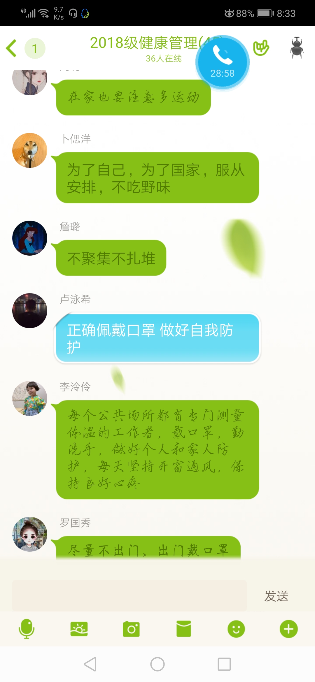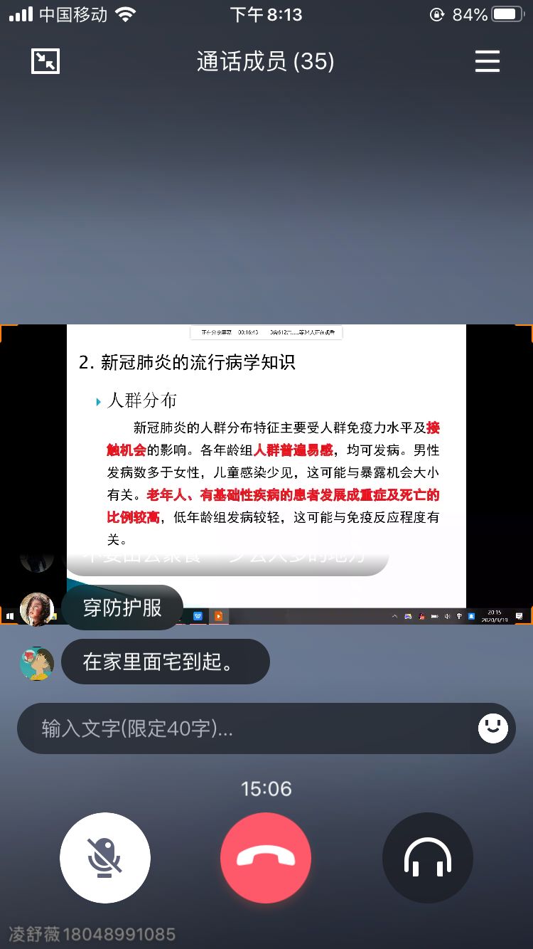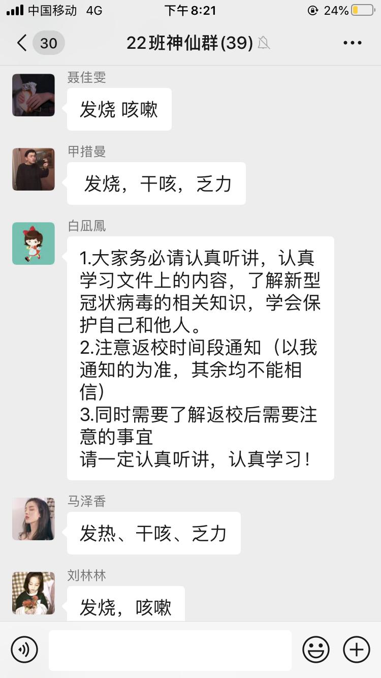 陈静老师在主题班会中跟同学们谈到:作为在校老员工,要服从公司安排,做好居家防疫,不提前返校,既是对他人负责,也是对自己负责。在此期间,大家要按时参加网课学习,保持乐观心态,加强运动锻炼。同时,陈老师还提醒大家,在网络信息化时代的今天,面对海量的网络信息要理性甄别,做到“不听谣、不信谣、不传谣”。