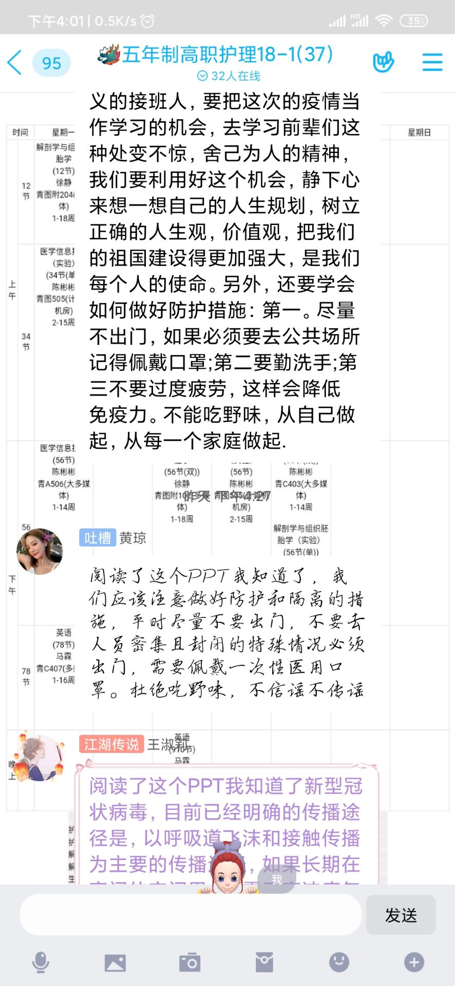 朱学坤老师以“众志成城、共克时艰”为主题组织同学们开展讨论,5年制护理18级1班的刘超同学表示:“作为社会主义接班人,我们应当把这次疫情当做一次学习机会,去学习前辈们处变不惊,舍己为人的精神,树立正确的人生观、价值观,规划好人生,努力学习成才,把祖国建设的更加强大。”朱学坤老师也希望同学们在一个个英雄的事迹中,学会勇敢、学会担当、知晓社会责任;同时也希望同学们在今后面对困难时,要勇于担当、迎难而上、攻坚克难,做到知行合一。