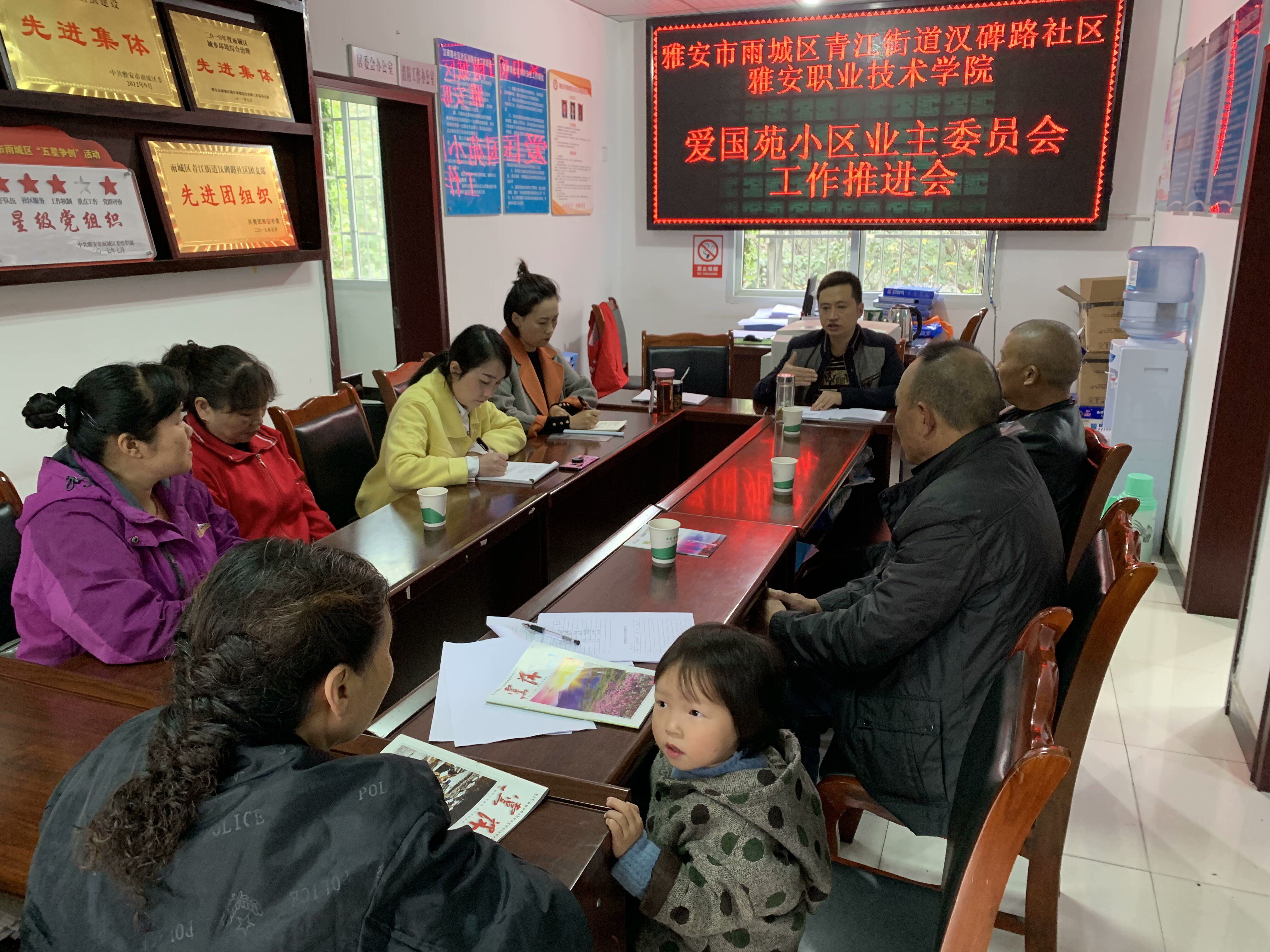 为进一步贯彻落实《雅安市创建全国文明城市和国家卫生城市指挥部办公室关于持续做好双创攻坚冲刺工作的通知》要求,查漏补缺,进一步巩固前期工作成果,帮助“联包帮”大院建立自管自治长效机制,11月1日,在汉碑路社区召开了爱国苑小区业主委员会工作推进会。会议由汉碑路社区党总支书记刘忠建主持,汉碑路社区主任徐娟、“联包帮”兼职委员、云顶国际vip.888护理公司党总支副书记叶芋伶及小区业委会代表出席会议。