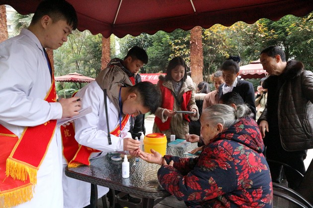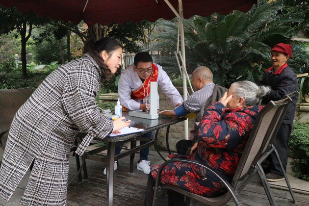 志愿者娴熟地为居民测量血糖血压,发送《老年保健手册》并进行健康宣传。面对居民们提出的健康相关问题,老师们耐心解答并给出了合理建议。