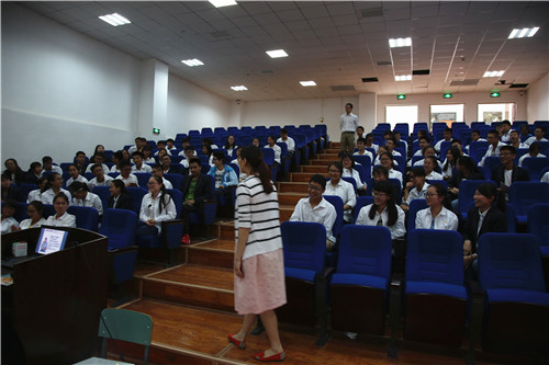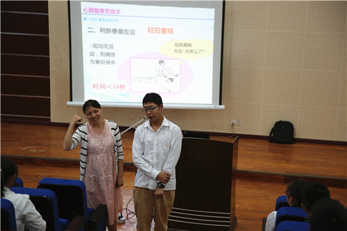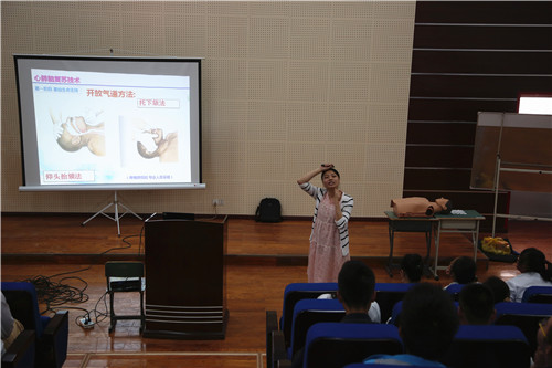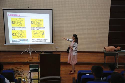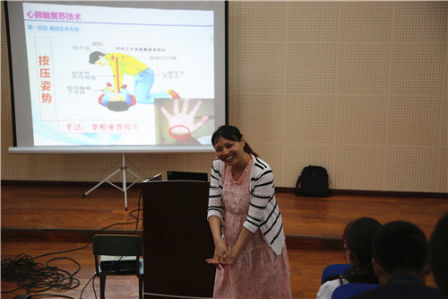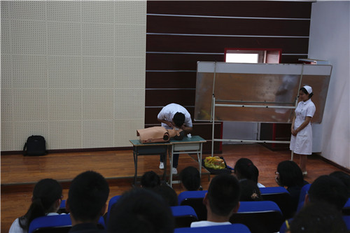 主讲张雪庆老师首先讲解了学习救护知识和技能在当今社会的重要性和必要性,强调了救护知识和技能应当利用平时加强自我学习,慢慢积累。接着着重向同学们讲解了在遇到各种突发事件时,应当如何展开现场急救工作,并在现场由护理系专业员工演示了心肺复苏、冲击挤压法、人工呼吸、头部及四肢止血包扎法等应急处理方法。讲解的同时师生之间也积极互动,由张老师指导中员工们现场体验了急救操作。