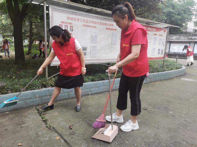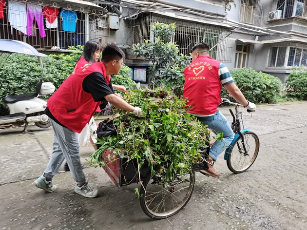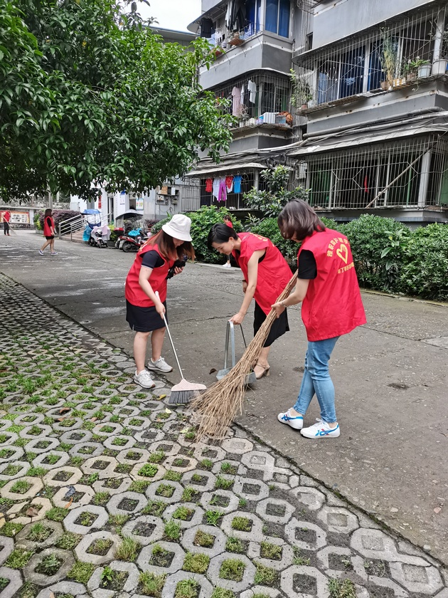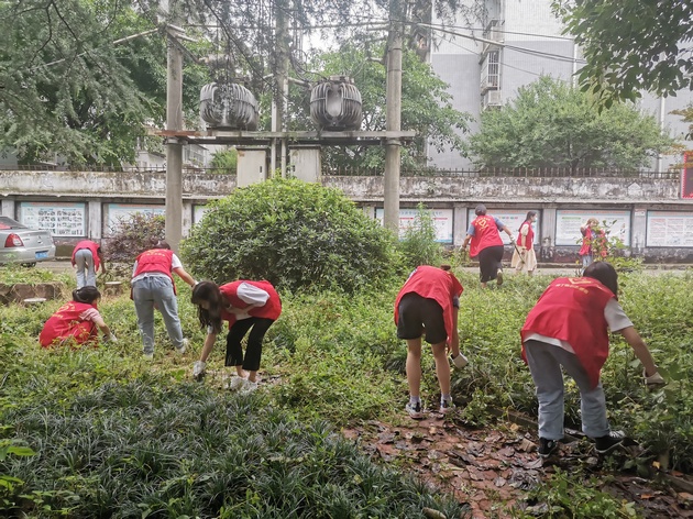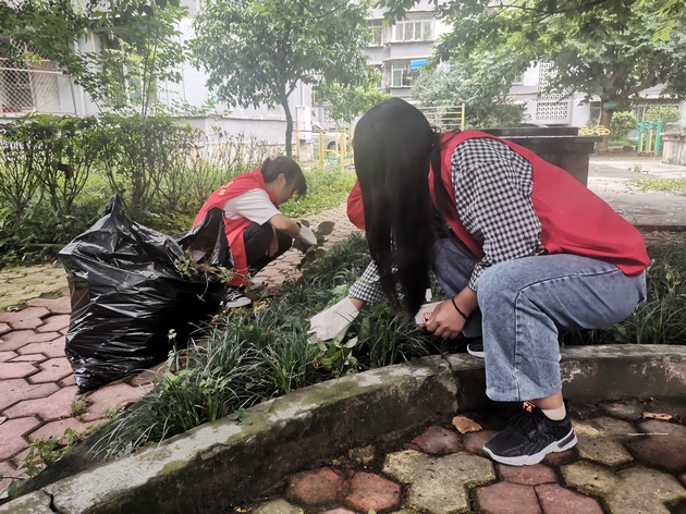 在爱国苑小区,党员教师和志愿者们铲除草坪内的杂草、打扫院落、清理垃圾。大家分工协作、配合默契,经过1个半小时,小区环境焕然一新。