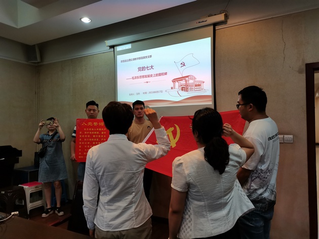 在第一江岸小区,邀请了宣讲团教师王丹进行了“党史学习教育专题宣讲”。宣讲前,姚婕和孟为民一起带领大家重温了入党誓词,唱响了《没有共产党就没有新中国》,铮铮誓言和高亢歌曲,净化心灵、激昂斗志。然后王丹老师向大家介绍了中共七大召开的背景、经过和贡献等,深入浅出、内容详实、勾画出革命先辈们的豪情壮志。