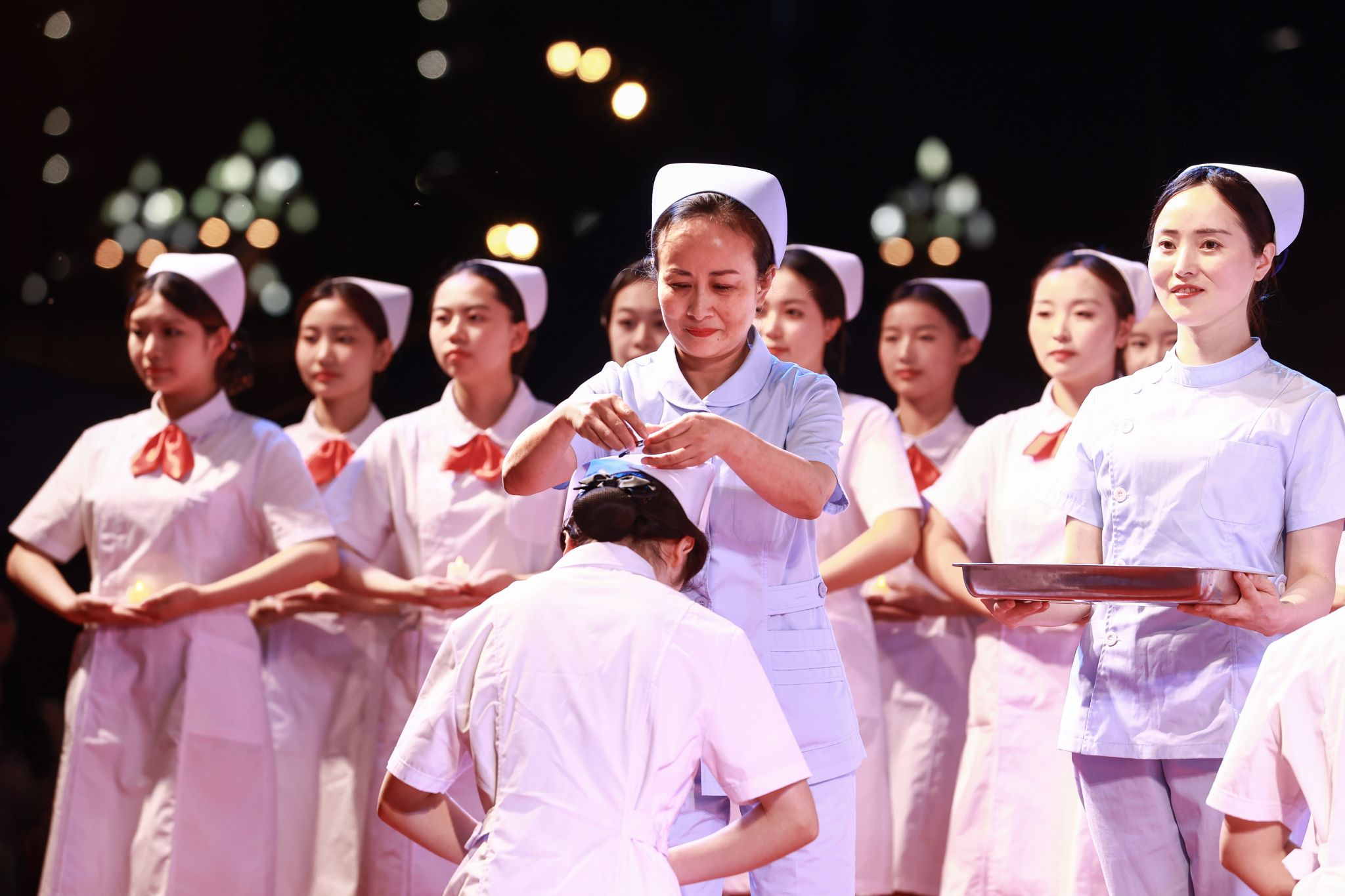 传光授帽仪式上,胡盛琳、黄丽琼、王青力、冯贤萍、王静、陈俊六位护理前辈为员工代表郑重地戴上洁白的燕尾帽,同学们怀揣着对护理事业的无上崇敬,庄严宣誓,表达了将传承与发扬南丁格尔精神,为护理事业奉献毕生的决心。现场3000余人手捧蜡烛合唱《让世界充满爱》,晚会在温暖感人的氛围中落下帷幕。